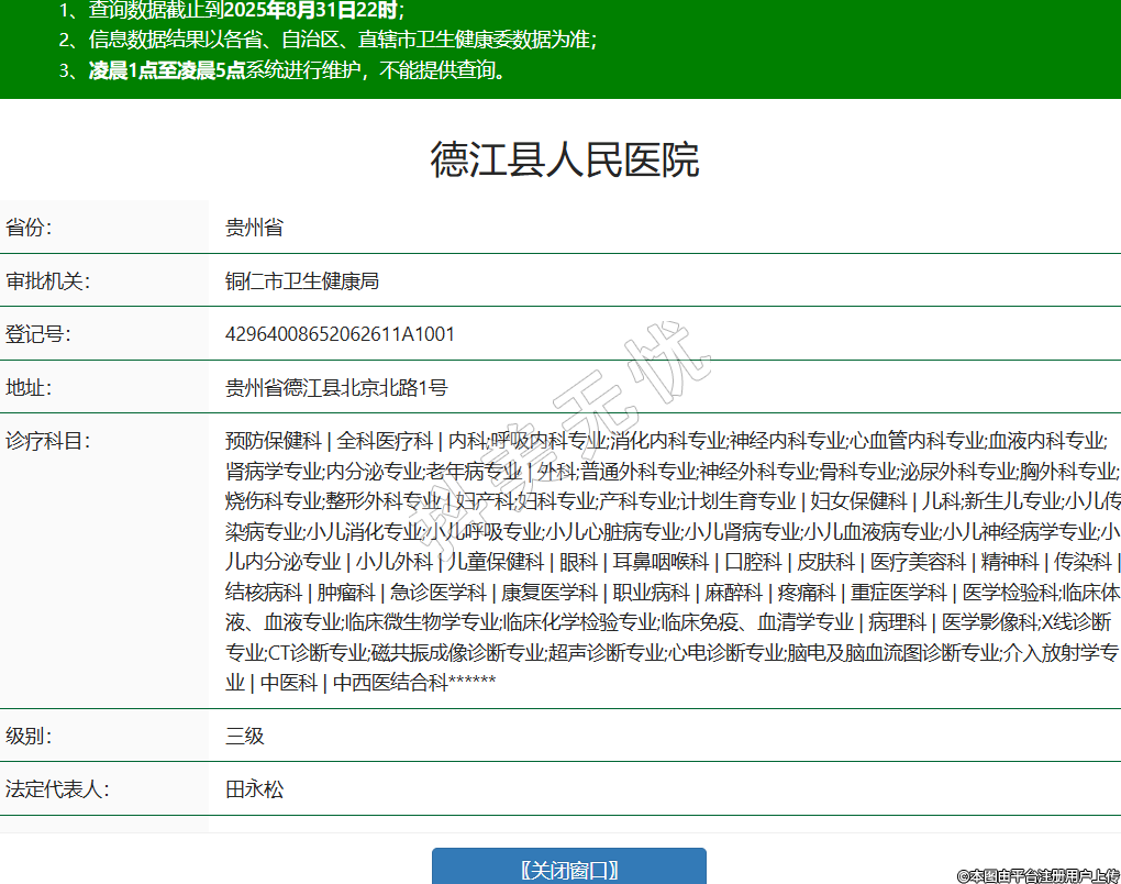 省份:貴州省審批機(jī)關(guān):銅仁市衛(wèi)生健康局登記號(hào):42964008652062611A1001地址:貴州省德江縣北京北路1號(hào)診療科目:預(yù)防保健科 | 全科醫(yī)療科 | 內(nèi)科;呼吸內(nèi)科專業(yè);消化內(nèi)科專業(yè);神經(jīng)內(nèi)科專業(yè);心血管內(nèi)科專業(yè);血液內(nèi)科專業(yè);腎病學(xué)專業(yè);內(nèi)分泌專業(yè);老年病專業(yè) | 外科;普通外科專業(yè);神經(jīng)外科專業(yè);骨科專業(yè);泌尿外科專業(yè);胸外科專業(yè);燒傷科專業(yè);整形外科專業(yè) | 婦產(chǎn)科;婦科專業(yè);產(chǎn)科專業(yè);計(jì)劃生育專業(yè) | 婦女保健科 | 兒科;新生兒專業(yè);小兒傳染病專業(yè);小兒消化專業(yè);小兒呼吸專業(yè);小兒心臟病專業(yè);小兒腎病專業(yè);小兒血液病專業(yè);小兒神經(jīng)病學(xué)專業(yè);小兒內(nèi)分泌專業(yè) | 小兒外科 | 兒童保健科 | 眼科 | 耳鼻咽喉科 | 口腔科 | 皮膚科 | 醫(yī)療美容科 | 精神科 | 傳染科 | 結(jié)核病科 | 腫瘤科 | 急診醫(yī)學(xué)科 | 康復(fù)醫(yī)學(xué)科 | 職業(yè)病科 | 麻醉科 | 疼痛科 | 重癥醫(yī)學(xué)科 | 醫(yī)學(xué)檢驗(yàn)科;臨床體液、血液專業(yè);臨床微生物學(xué)專業(yè);臨床化學(xué)檢驗(yàn)專業(yè);臨床免疫、血清學(xué)專業(yè) | 病理科 | 醫(yī)學(xué)影像科;X線診斷專業(yè);CT診斷專業(yè);磁共振成像診斷專業(yè);超聲診斷專業(yè);心電診斷專業(yè);腦電及腦血流圖診斷專業(yè);介入放射學(xué)專業(yè) | 中醫(yī)科 | 中西醫(yī)結(jié)合科******級(jí)別:三級(jí)法定代表人:田永松主要負(fù)責(zé)人:田永松執(zhí)業(yè)許可證有效期:2014/10/10 -至- 2029/10/09 -