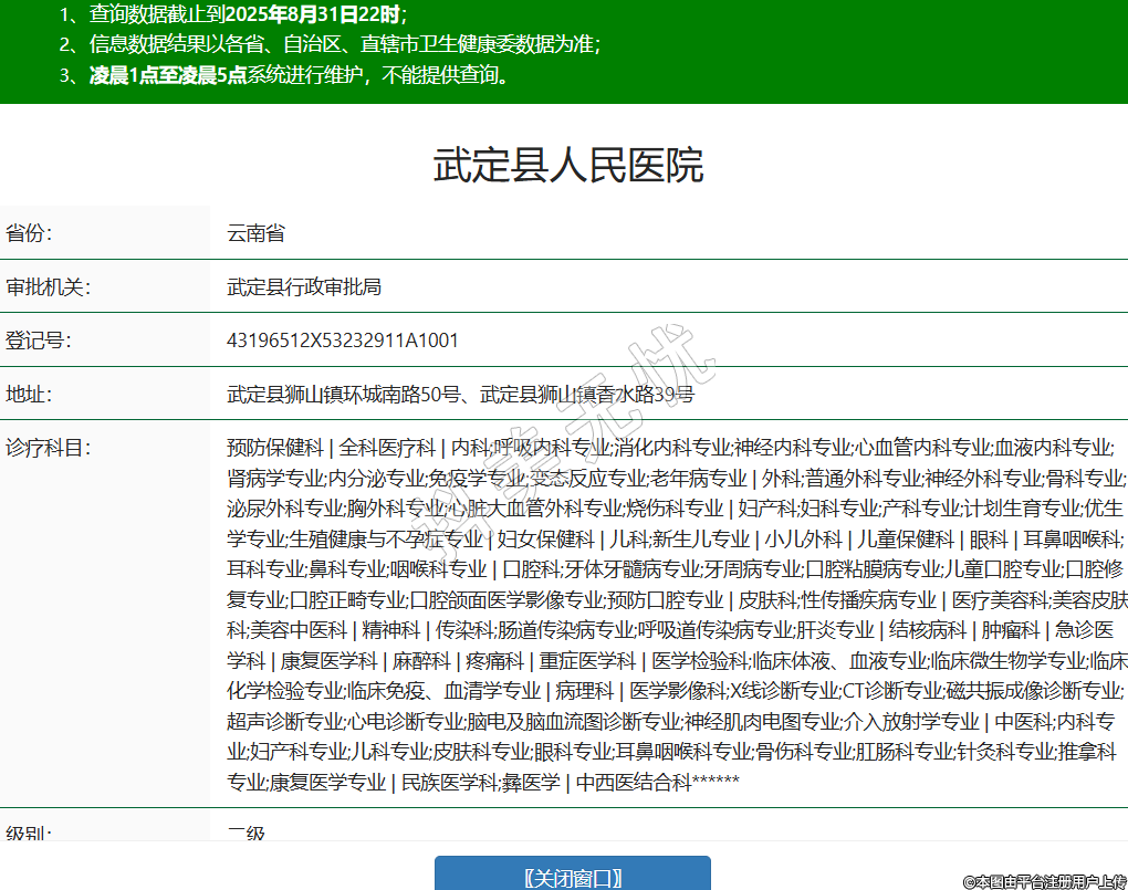 省份:云南省審批機(jī)關(guān):武定縣行政審批局登記號(hào):43196512X53232911A1001地址:武定縣獅山鎮(zhèn)環(huán)城南路50號(hào)、武定縣獅山鎮(zhèn)香水路39號(hào)診療科目:預(yù)防保健科 | 全科醫(yī)療科 | 內(nèi)科;呼吸內(nèi)科專業(yè);消化內(nèi)科專業(yè);神經(jīng)內(nèi)科專業(yè);心血管內(nèi)科專業(yè);血液內(nèi)科專業(yè);腎病學(xué)專業(yè);內(nèi)分泌專業(yè);免疫學(xué)專業(yè);變態(tài)反應(yīng)專業(yè);老年病專業(yè) | 外科;普通外科專業(yè);神經(jīng)外科專業(yè);骨科專業(yè);泌尿外科專業(yè);胸外科專業(yè);心臟大血管外科專業(yè);燒傷科專業(yè) | 婦產(chǎn)科;婦科專業(yè);產(chǎn)科專業(yè);計(jì)劃生育專業(yè);優(yōu)生學(xué)專業(yè);生殖健康與不孕癥專業(yè) | 婦女保健科 | 兒科;新生兒專業(yè) | 小兒外科 | 兒童保健科 | 眼科 | 耳鼻咽喉科;耳科專業(yè);鼻科專業(yè);咽喉科專業(yè) | 口腔科;牙體牙髓病專業(yè);牙周病專業(yè);口腔粘膜病專業(yè);兒童口腔專業(yè);口腔修復(fù)專業(yè);口腔正畸專業(yè);口腔頜面醫(yī)學(xué)影像專業(yè);預(yù)防口腔專業(yè) | 皮膚科;性傳播疾病專業(yè) | 醫(yī)療美容科;美容皮膚科;美容中醫(yī)科 | 精神科 | 傳染科;腸道傳染病專業(yè);呼吸道傳染病專業(yè);肝炎專業(yè) | 結(jié)核病科 | 腫瘤科 | 急診醫(yī)學(xué)科 | 康復(fù)醫(yī)學(xué)科 | 麻醉科 | 疼痛科 | 重癥醫(yī)學(xué)科 | 醫(yī)學(xué)檢驗(yàn)科;臨床體液、血液專業(yè);臨床微生物學(xué)專業(yè);臨床化學(xué)檢驗(yàn)專業(yè);臨床免疫、血清學(xué)專業(yè) | 病理科 | 醫(yī)學(xué)影像科;X線診斷專業(yè);CT診斷專業(yè);磁共振成像診斷專業(yè);超聲診斷專業(yè);心電診斷專業(yè);腦電及腦血流圖診斷專業(yè);神經(jīng)肌肉電圖專業(yè);介入放射學(xué)專業(yè) | 中醫(yī)科;內(nèi)科專業(yè);婦產(chǎn)科專業(yè);兒科專業(yè);皮膚科專業(yè);眼科專業(yè);耳鼻咽喉科專業(yè);骨傷科專業(yè);肛腸科專業(yè);針灸科專業(yè);推拿科專業(yè);康復(fù)醫(yī)學(xué)專業(yè) | 民族醫(yī)學(xué)科;彝醫(yī)學(xué) | 中西醫(yī)結(jié)合科******級(jí)別:二級(jí)法定代表人:閆浩主要負(fù)責(zé)人:閆浩執(zhí)業(yè)許可證有效期:2024/12/10 -至- 2037/12/31 -