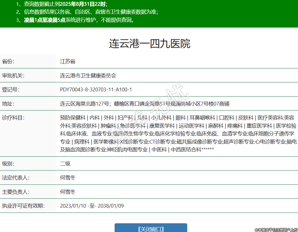省份:江蘇省審批機關(guān):連云港市衛(wèi)生健康委員會登記號:PDY70043-8-320703-11-A100-1地址:連云區(qū)海棠北路127號;贛榆區(qū)青口鎮(zhèn)金海路51號觀瀾尚城小區(qū)7號樓07商鋪診療科目:預(yù)防保健科 | 內(nèi)科 | 外科 | 婦產(chǎn)科 | 兒科 | 小兒外科 | 眼科 | 耳鼻咽喉科 | 口腔科 | 皮膚科 | 醫(yī)療美容科;美容外科;美容皮膚科 | 腫瘤科 | 急診醫(yī)學(xué)科 | 康復(fù)醫(yī)學(xué)科 | 運動醫(yī)學(xué)科 | 麻醉科 | 疼痛科 | 重癥醫(yī)學(xué)科 | 醫(yī)學(xué)檢驗科;臨床體液、血液專業(yè);臨床微生物學(xué)專業(yè);臨床化學(xué)檢驗專業(yè);臨床免疫、血清學(xué)專業(yè);臨床細(xì)胞分子遺傳學(xué)專業(yè) | 病理科 | 醫(yī)學(xué)影像科;X線診斷專業(yè);CT診斷專業(yè);磁共振成像診斷專業(yè);超聲診斷專業(yè);心電診斷專業(yè);腦電及腦血流圖診斷專業(yè);神經(jīng)肌肉電圖專業(yè) | 中醫(yī)科 | 中西醫(yī)結(jié)合科******級別:二級法定代表人:何雪冬主要負(fù)責(zé)人:何雪冬執(zhí)業(yè)許可證有效期:2023/01/10 -至- 2038/01/09 -