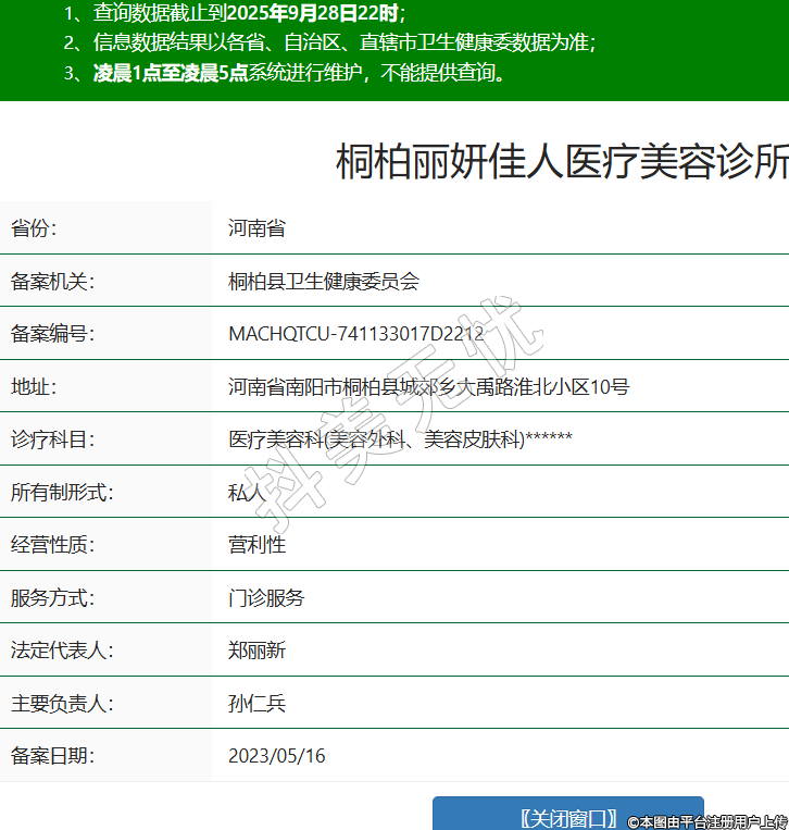 省份:河南省備案機(jī)關(guān):桐柏縣衛(wèi)生健康委員會(huì)備案編號(hào):MACHQTCU-741133017D2212地址:河南省南陽(yáng)市桐柏縣城郊鄉(xiāng)大禹路淮北小區(qū)10號(hào)診療科目:醫(yī)療美容科(美容外科、美容皮膚科)******所有制形式:私人經(jīng)營(yíng)性質(zhì):營(yíng)利性服務(wù)方式:門診服務(wù)法定代表人:鄭麗新主要負(fù)責(zé)人:孫仁兵備案日期:2023/05/16 -