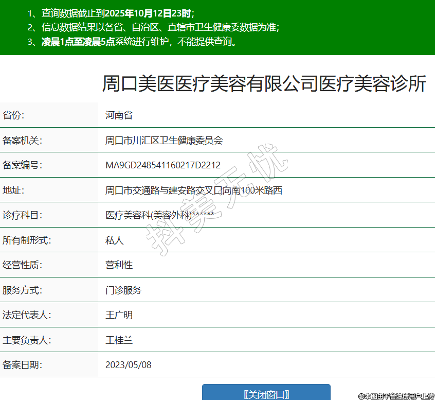 省份:河南省備案機關:周口市川匯區(qū)衛(wèi)生健康委員會備案編號:MA9GD248541160217D2212地址:周口市交通路與建安路交叉口向南100米路西診療科目:醫(yī)療美容科(美容外科)******所有制形式:私人經營性質:營利性服務方式:門診服務法定代表人:王廣明主要負責人:王桂蘭 -