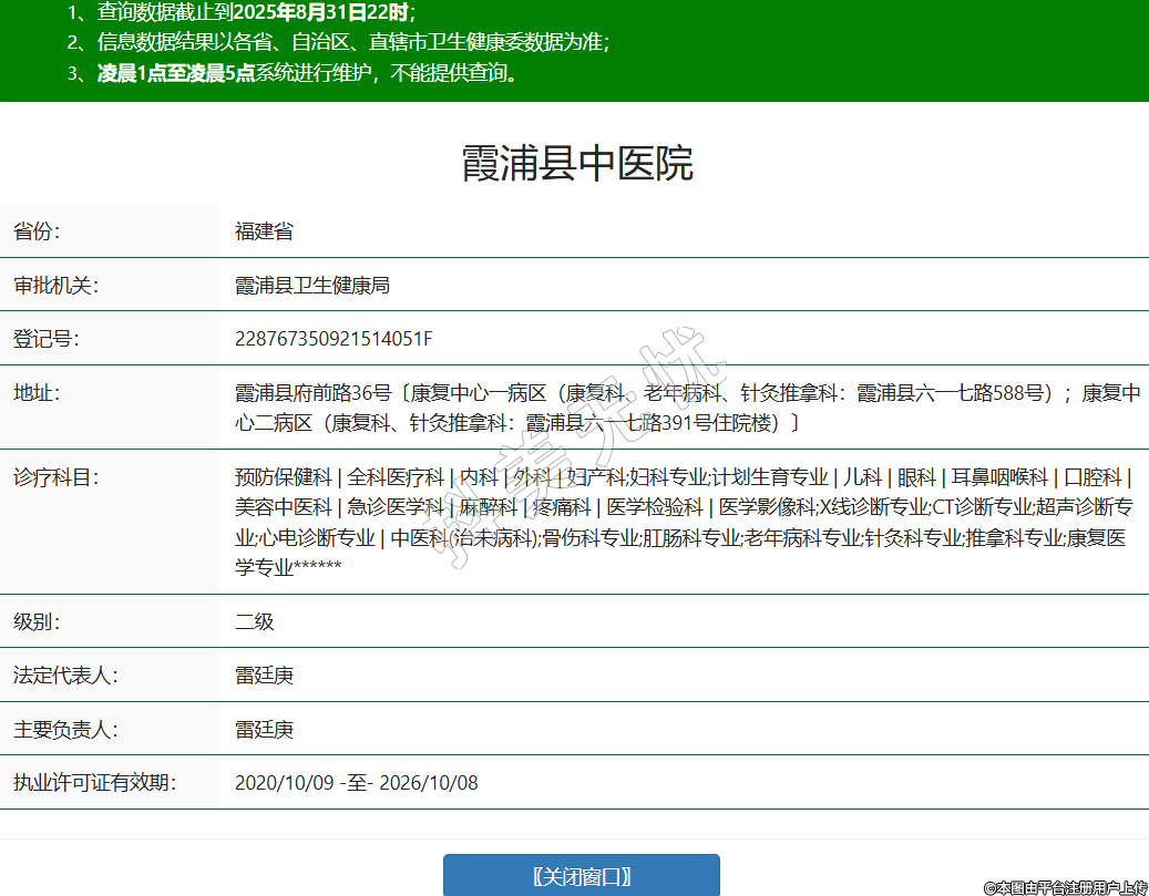 省份:福建省審批機(jī)關(guān):霞浦縣衛(wèi)生健康局登記號(hào):228767350921514051F地址:霞浦縣府前路36號(hào)〔康復(fù)中心一病區(qū)(康復(fù)科、老年病科、針灸推拿科:霞浦縣六一七路588號(hào));康復(fù)中心二病區(qū)(康復(fù)科、針灸推拿科:霞浦縣六一七路391號(hào)住院樓)〕診療科目:預(yù)防保健科 | 全科醫(yī)療科 | 內(nèi)科 | 外科 | 婦產(chǎn)科;婦科專業(yè);計(jì)劃生育專業(yè) | 兒科 | 眼科 | 耳鼻咽喉科 | 口腔科 | 美容中醫(yī)科 | 急診醫(yī)學(xué)科 | 麻醉科 | 疼痛科 | 醫(yī)學(xué)檢驗(yàn)科 | 醫(yī)學(xué)影像科;X線診斷專業(yè);CT診斷專業(yè);超聲診斷專業(yè);心電診斷專業(yè) | 中醫(yī)科(治未病科);骨傷科專業(yè);肛腸科專業(yè);老年病科專業(yè);針灸科專業(yè);推拿科專業(yè);康復(fù)醫(yī)學(xué)專業(yè)******級(jí)別:二級(jí)法定代表人:雷廷庚主要負(fù)責(zé)人:雷廷庚執(zhí)業(yè)許可證有效期:2020/10/09 -至- 2026/10/08 -