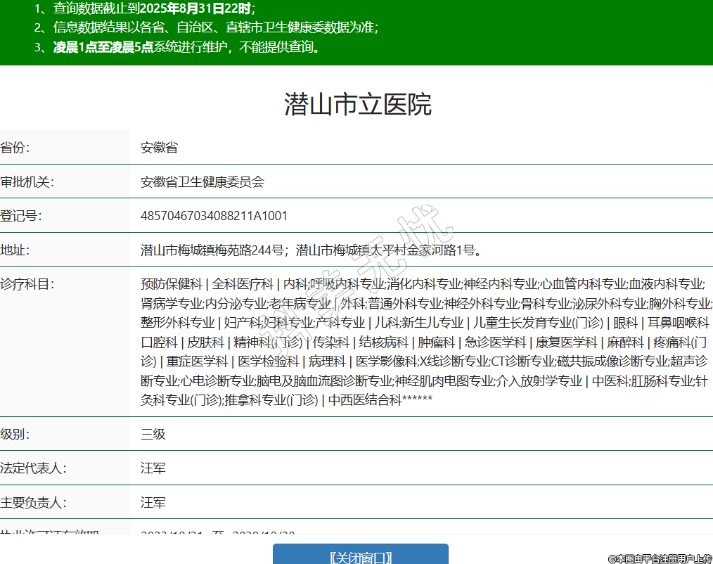 省份:安徽省審批機(jī)關(guān):安徽省衛(wèi)生健康委員會(huì)登記號(hào):48570467034088211A1001地址:潛山市梅城鎮(zhèn)梅苑路244號(hào);潛山市梅城鎮(zhèn)太平村金家河路1號(hào)。診療科目:預(yù)防保健科 | 全科醫(yī)療科 | 內(nèi)科;呼吸內(nèi)科專業(yè);消化內(nèi)科專業(yè);神經(jīng)內(nèi)科專業(yè);心血管內(nèi)科專業(yè);血液內(nèi)科專業(yè);腎病學(xué)專業(yè);內(nèi)分泌專業(yè);老年病專業(yè) | 外科;普通外科專業(yè);神經(jīng)外科專業(yè);骨科專業(yè);泌尿外科專業(yè);胸外科專業(yè);整形外科專業(yè) | 婦產(chǎn)科;婦科專業(yè);產(chǎn)科專業(yè) | 兒科;新生兒專業(yè) | 兒童生長(zhǎng)發(fā)育專業(yè)(門診) | 眼科 | 耳鼻咽喉科 | 口腔科 | 皮膚科 | 精神科(門診) | 傳染科 | 結(jié)核病科 | 腫瘤科 | 急診醫(yī)學(xué)科 | 康復(fù)醫(yī)學(xué)科 | 麻醉科 | 疼痛科(門診) | 重癥醫(yī)學(xué)科 | 醫(yī)學(xué)檢驗(yàn)科 | 病理科 | 醫(yī)學(xué)影像科;X線診斷專業(yè);CT診斷專業(yè);磁共振成像診斷專業(yè);超聲診斷專業(yè);心電診斷專業(yè);腦電及腦血流圖診斷專業(yè);神經(jīng)肌肉電圖專業(yè);介入放射學(xué)專業(yè) | 中醫(yī)科;肛腸科專業(yè);針灸科專業(yè)(門診);推拿科專業(yè)(門診) | 中西醫(yī)結(jié)合科******級(jí)別:三級(jí)法定代表人:汪軍主要負(fù)責(zé)人:汪軍執(zhí)業(yè)許可證有效期:2023/10/31 -至- 2038/10/30 -