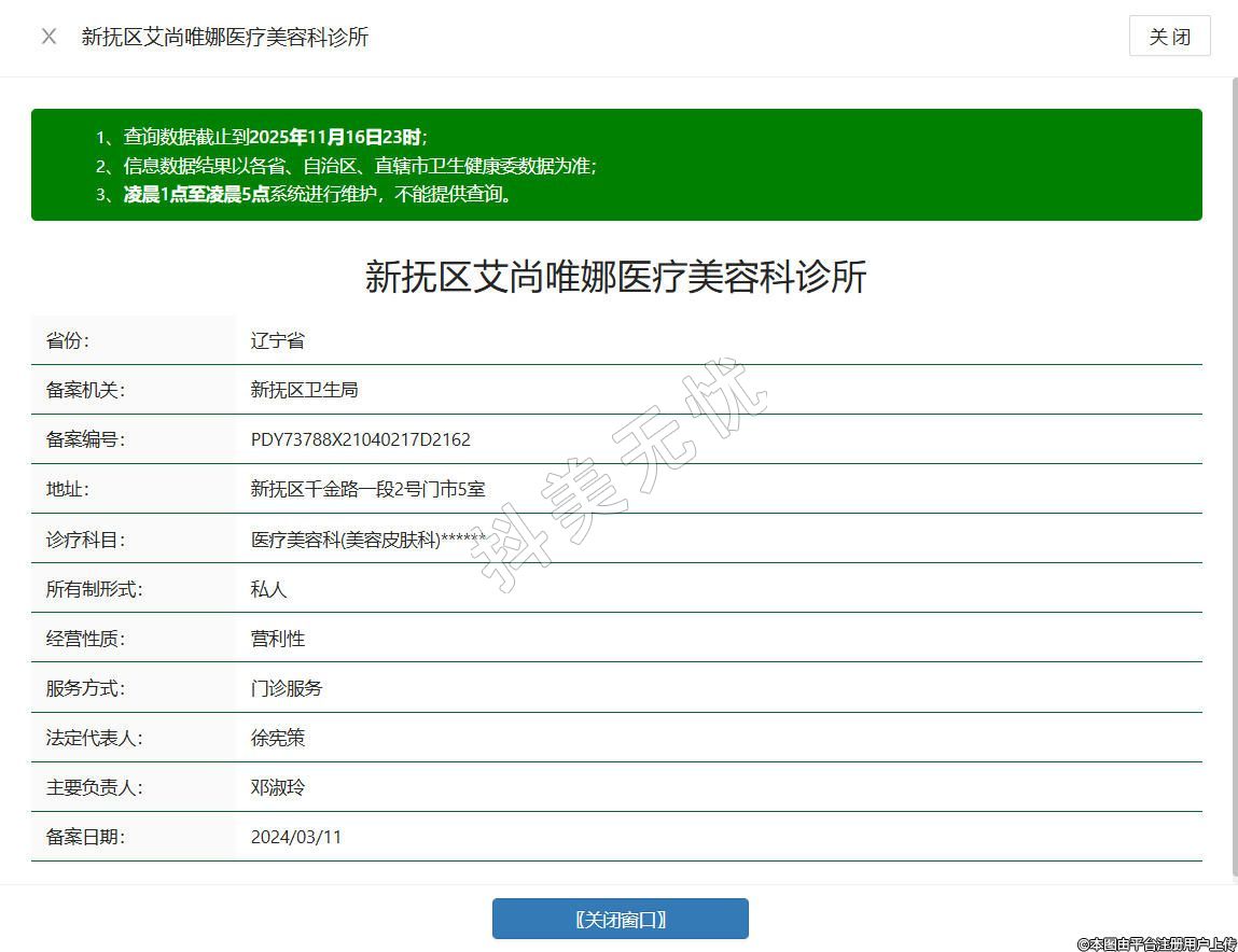 撫順艾尚唯娜醫(yī)療美容診所成立于2023年,位于遼寧省撫順市新撫區(qū)千金路一段2號門市5室,始終堅守合法合規(guī)經營原則,嚴格遵循《醫(yī)療美容服務管理辦法》等相關規(guī)定。秉持 “專業(yè)塑美,匠心至臻” 核心理念,匯聚專業(yè)醫(yī)師團隊,診療范圍涵蓋皮膚管理、眼部等合規(guī)醫(yī)美項目,引進符合標準的專業(yè)設備,以安全為基石,為顧客提供合規(guī)可靠的醫(yī)美服務。