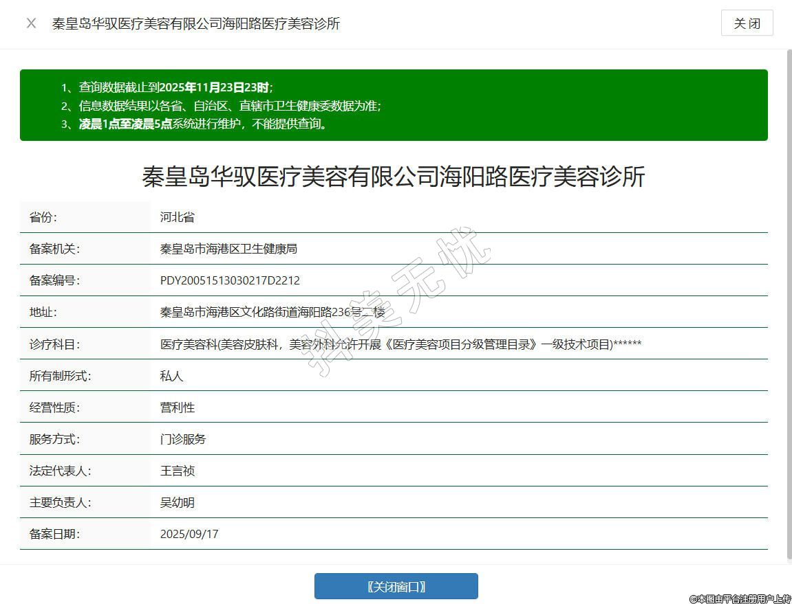秦皇島華馭醫(yī)療美容診所成立于2025年,位于秦皇島市海港區(qū)文化路街道海陽路236號二樓,是持有《醫(yī)療機構(gòu)執(zhí)業(yè)許可證》的合規(guī)醫(yī)美機構(gòu),嚴匯聚經(jīng)驗豐富的醫(yī)美醫(yī)師團隊,以專業(yè)技術(shù)與美學理念為支撐,提供面部抗衰、皮膚護理、唇部整形等合規(guī)醫(yī)美服務(wù),秉持 “規(guī)范診療、個性定制” 的服務(wù)理念,從咨詢評估到方案制定,全程注重溝通與隱私保護,為求美者提供安心、專業(yè)的醫(yī)美體驗。