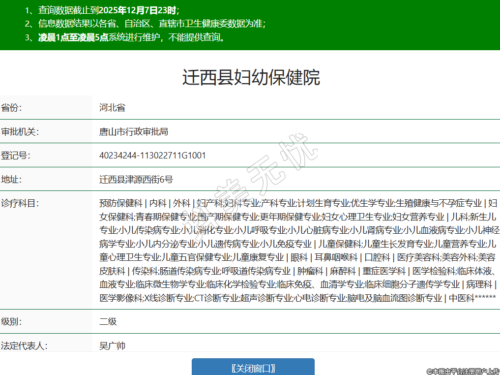 省份:河北省審批機(jī)關(guān):唐山市行政審批局登記號:40234244-113022711G1001地址:遷西縣津源西街6號診療科目:預(yù)防保健科 | 內(nèi)科 | 外科 | 婦產(chǎn)科;婦科專業(yè);產(chǎn)科專業(yè);計(jì)劃生育專業(yè);優(yōu)生學(xué)專業(yè);生殖健康與不孕癥專業(yè) | 婦女保健科;青春期保健專業(yè);圍產(chǎn)期保健專業(yè);更年期保健專業(yè);婦女心理衛(wèi)生專業(yè);婦女營養(yǎng)專業(yè) | 兒科;新生兒專業(yè);小兒傳染病專業(yè);小兒消化專業(yè);小兒呼吸專業(yè);小兒心臟病專業(yè);小兒腎病專業(yè);小兒血液病專業(yè);小兒神經(jīng)病學(xué)專業(yè);小兒內(nèi)分泌專業(yè);小兒遺傳病專業(yè);小兒免疫專業(yè) | 兒童保健科;兒童生長發(fā)育專業(yè);兒童營養(yǎng)專業(yè);兒童心理衛(wèi)生專業(yè);兒童五官保健專業(yè);兒童康復(fù)專業(yè) | 眼科 | 耳鼻咽喉科 | 口腔科 | 醫(yī)療美容科;美容外科;美容皮膚科 | 傳染科;腸道傳染病專業(yè);呼吸道傳染病專業(yè) | 腫瘤科 | 麻醉科 | 重癥醫(yī)學(xué)科 | 醫(yī)學(xué)檢驗(yàn)科;臨床體液、血液專業(yè);臨床微生物學(xué)專業(yè);臨床化學(xué)檢驗(yàn)專業(yè);臨床免疫、血清學(xué)專業(yè);臨床細(xì)胞分子遺傳學(xué)專業(yè) | 病理科 | 醫(yī)學(xué)影像科;X線診斷專業(yè);CT診斷專業(yè);超聲診斷專業(yè);心電診斷專業(yè);腦電及腦血流圖診斷專業(yè) | 中醫(yī)科******級別:二級法定代表人:吳廣帥主要負(fù)責(zé)人:吳廣帥執(zhí)業(yè)許可證有效期:2025/09/28 -至- 2026/12/30 -
