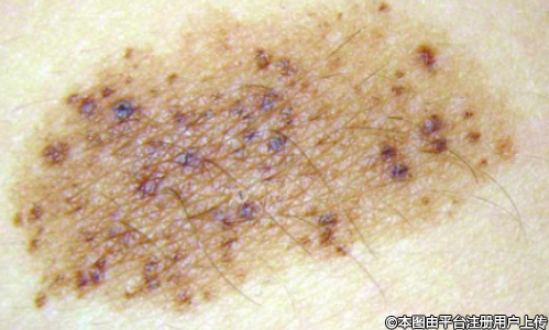 背景斑邊界清楚,上面的深色小點可以是各種痣,如交界痣、復合痣、皮內(nèi)痣、藍痣、日光性雀斑樣痣或先天性色素痣。